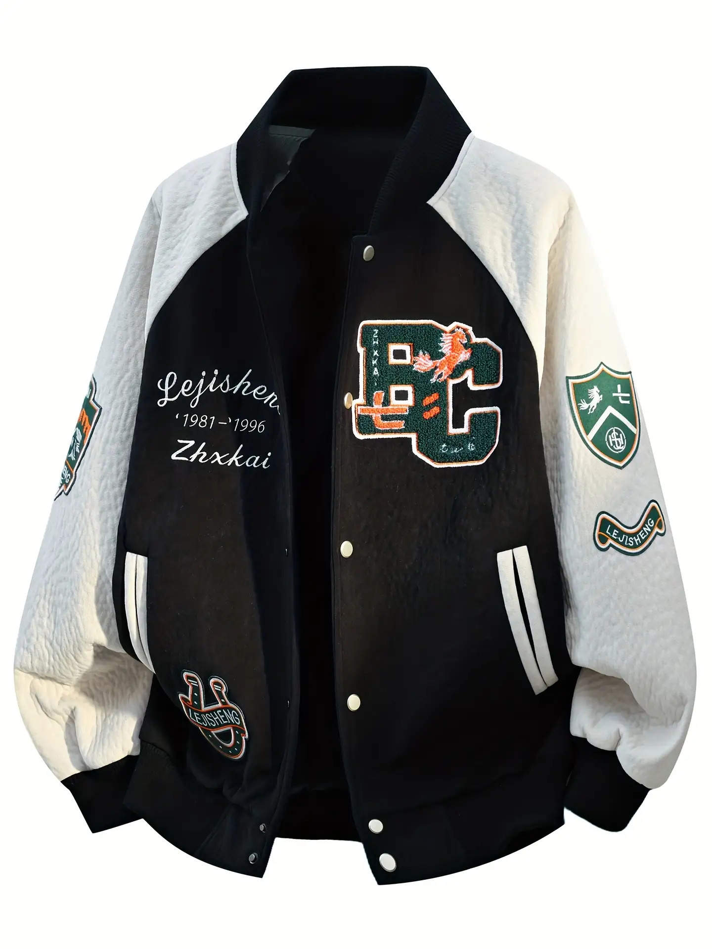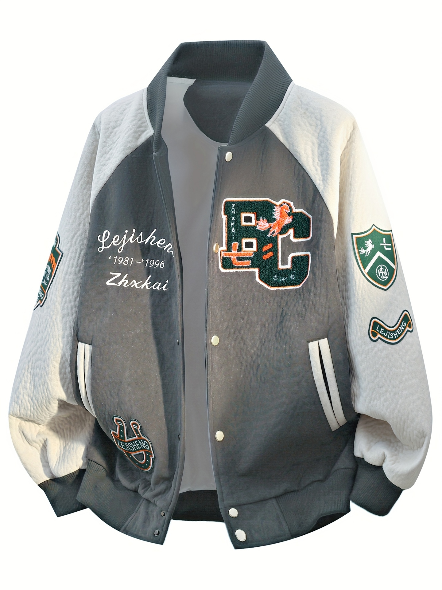 Men's Large Size Heavy-Duty Embellished Varsity Jacket - Mint Green & White Two-Tone with Lettering, Team Logos & Number 95 Emblem - Machine Washable Button-Front Coat for Casual Wear, Events & Themed Parties (V, PLUS SIZE