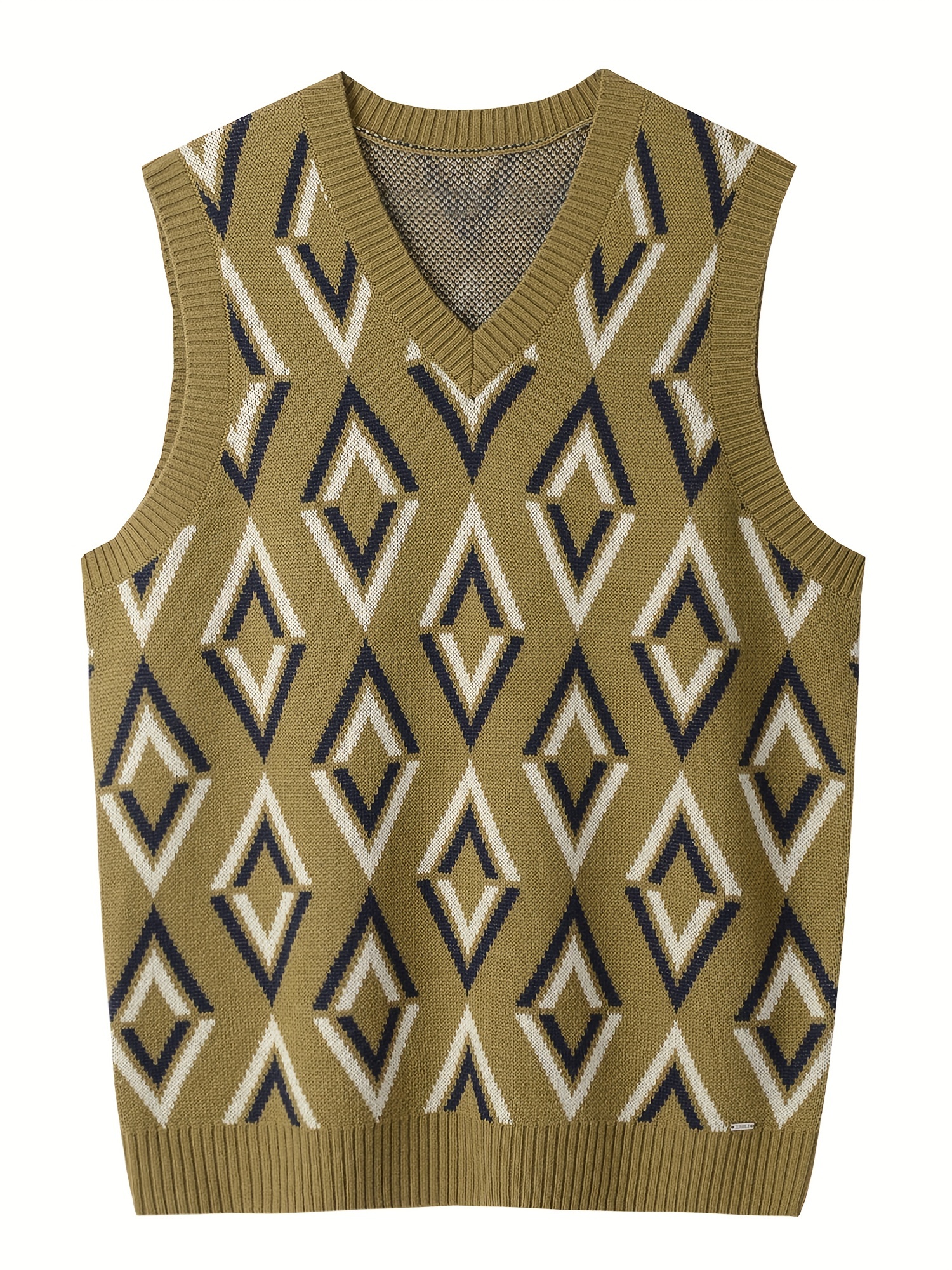 Men's Soft Beige/Brown/Argyle Sweater Vest - Slim Fit V-Neck Pullover, Knit Office & Formal Attire, Autumn/Winter Layering Piece for Business Casual or Casual Attire, Sophisticated Weave, Ribbed Texture, PLUS SIZE