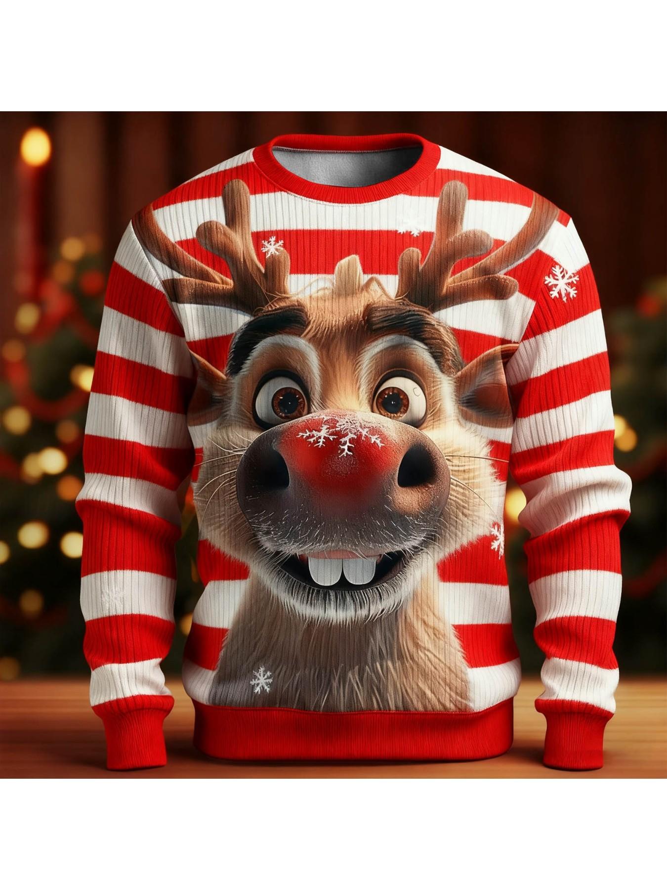 Men'S & Women'S Ugly Christmas Sweater - Reindeer & Snowflake Print Thermal Winter Pullover, Soft Ribbed Crewneck Sweatshirt with Red & Green Stripes, Plus Size