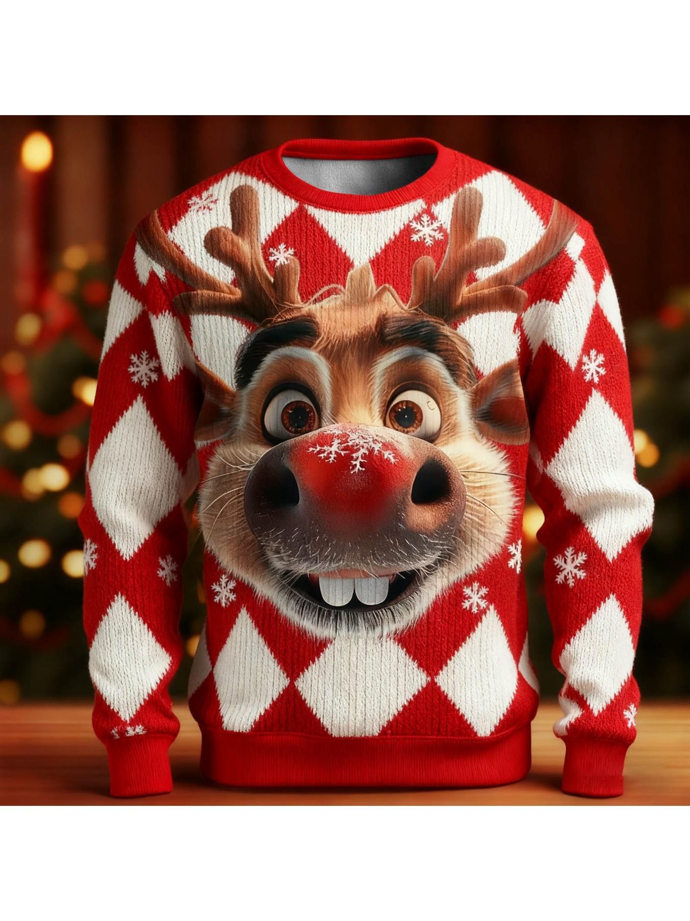 Men'S & Women'S Ugly Christmas Sweater - Reindeer Face & Snowflake Design, Soft Thermal Winter Pullover, Red & Holiday Sweater for Christmas Party Outfits, Plus Size