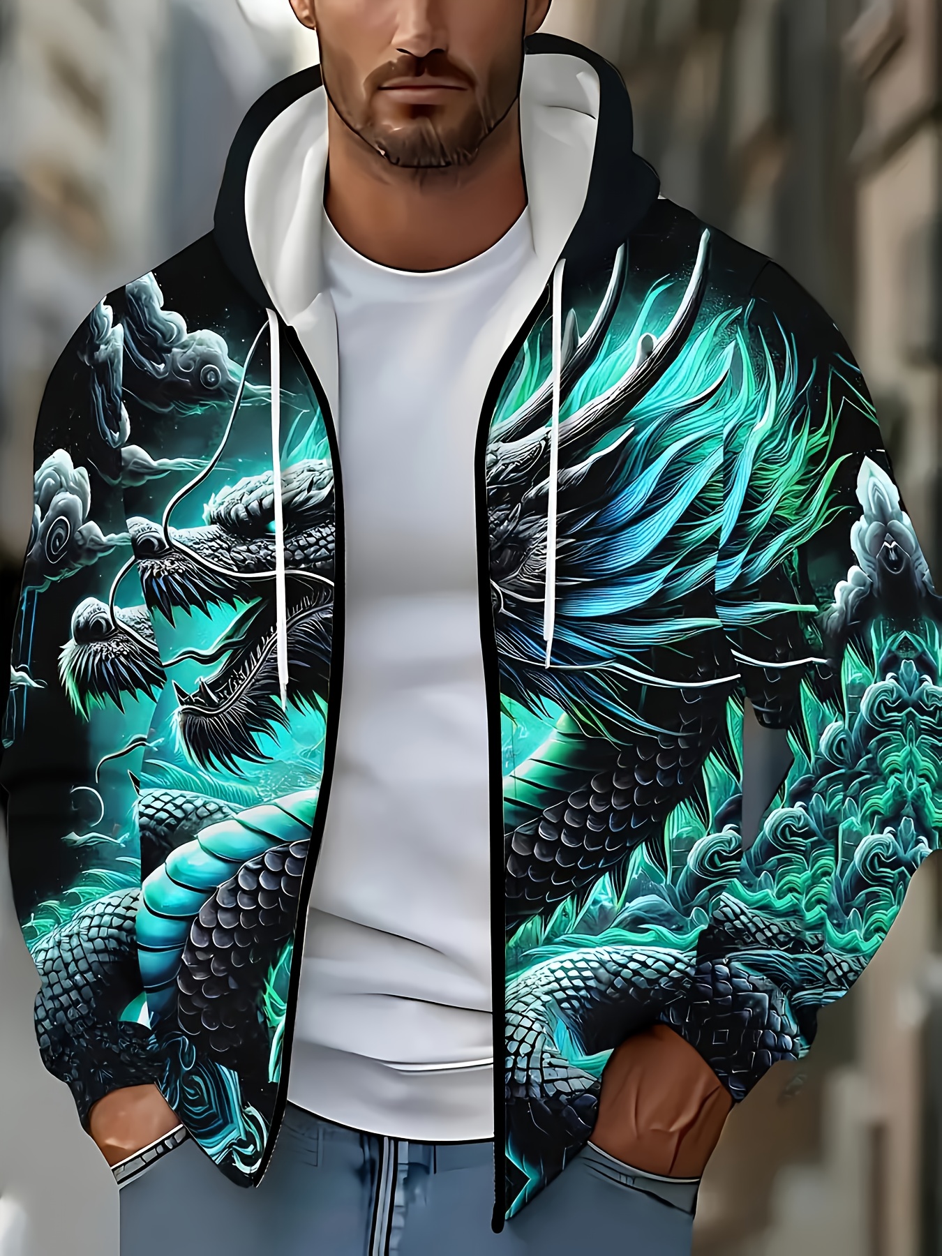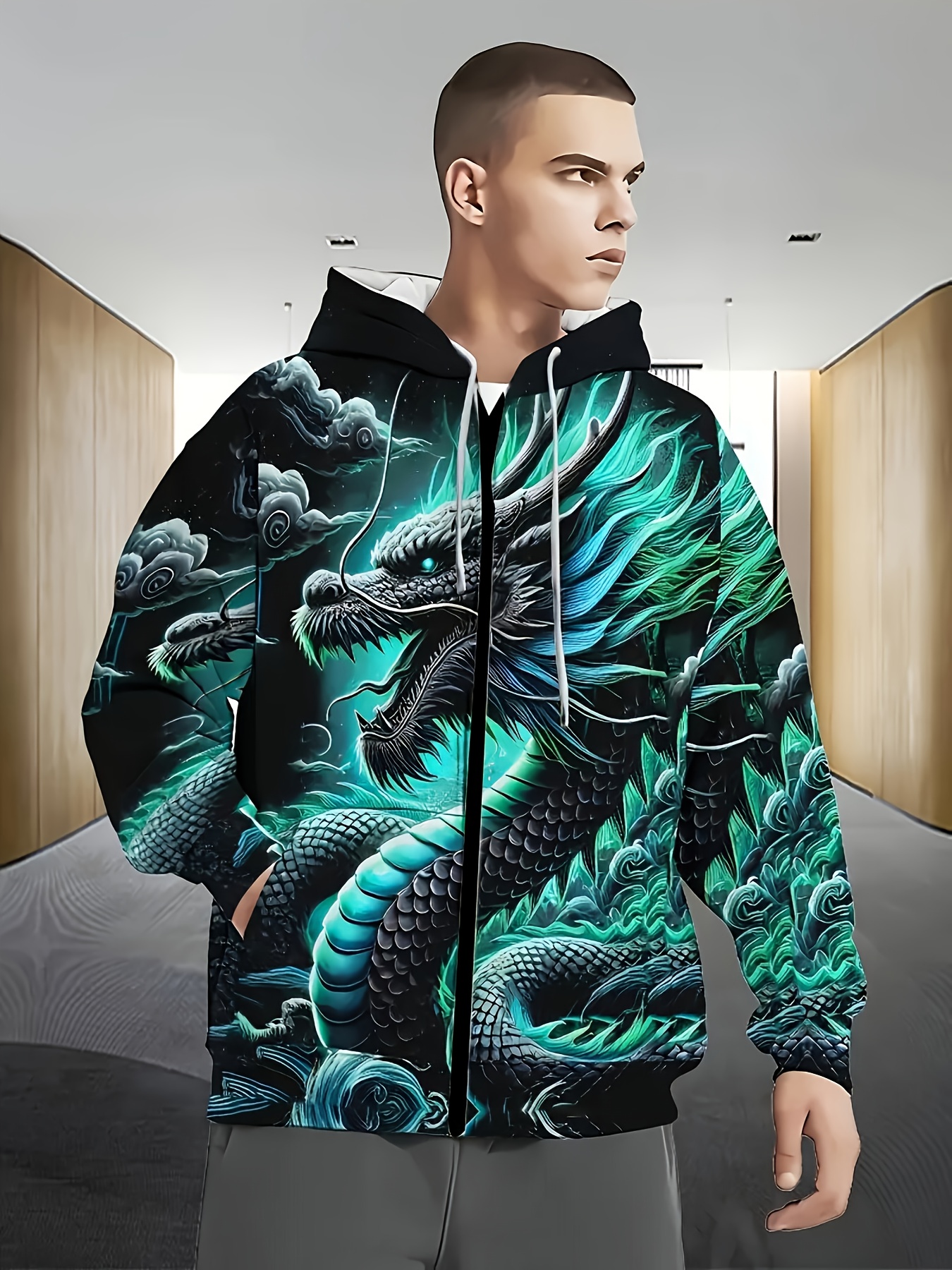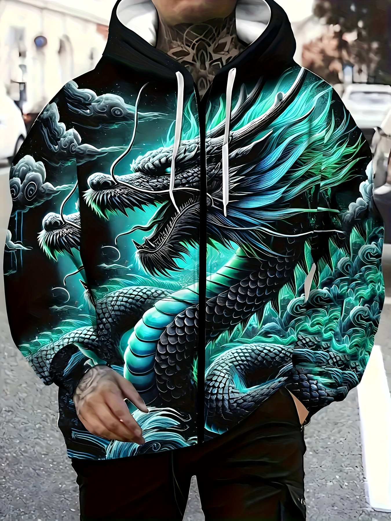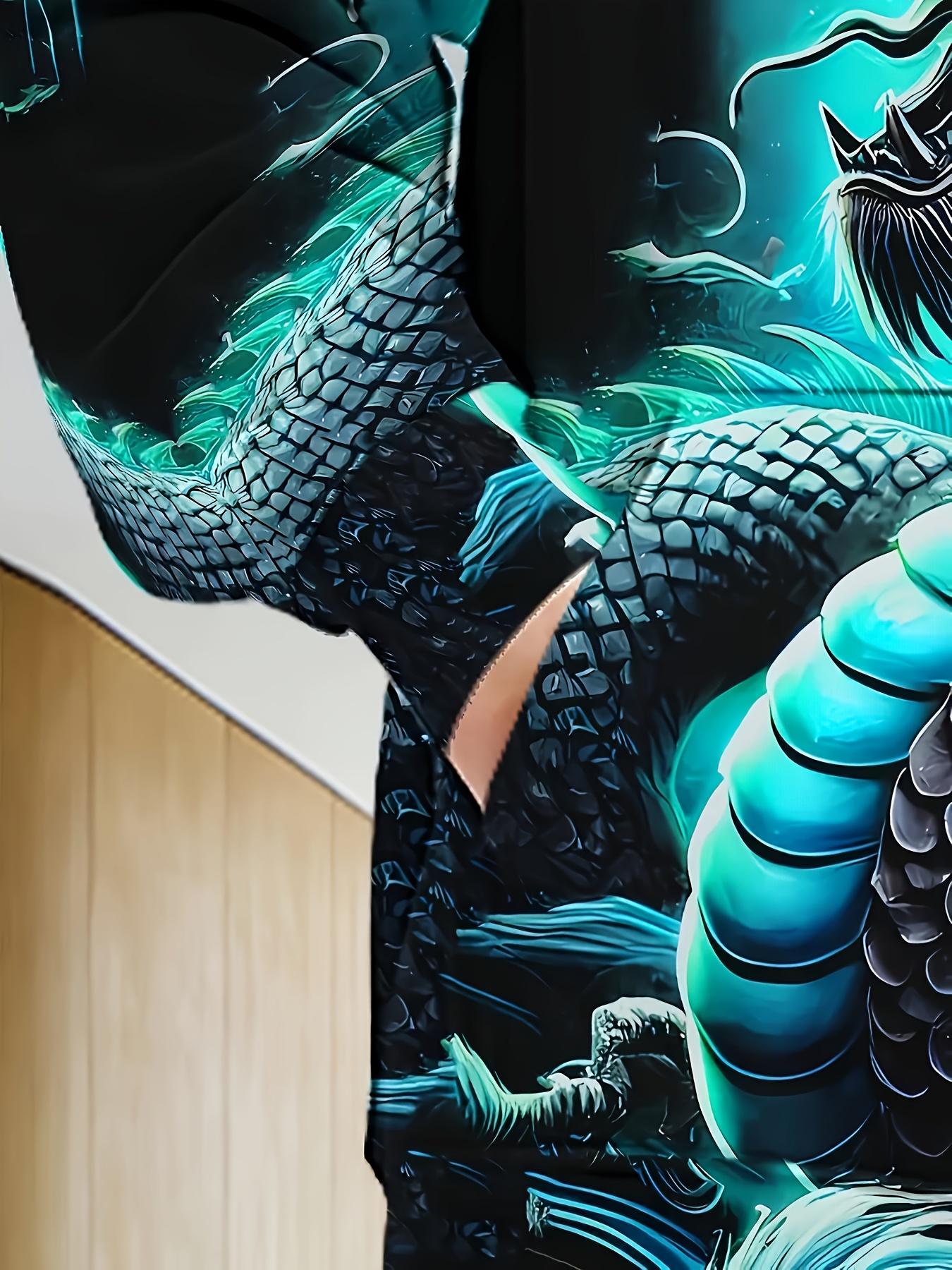 Men's Japanese Dragon Print Hooded Zip-Up Jacket - Turquoise Blue & Black 3D Scale Design, Full-Zip Korean/Kazoku Style Coat, Anime/Manga Inspired Casual Wear, Breathable & Machine Washable, Plus Size Relaxed Fit for Gym, Running, Spring/Fall Outdoor - Japanese Dragon Motif with Full-Length Zipper Closure, No Lining, Standout Statement Piece for Men's Fashion (Casual & Statement Outfit), PLUS SIZE