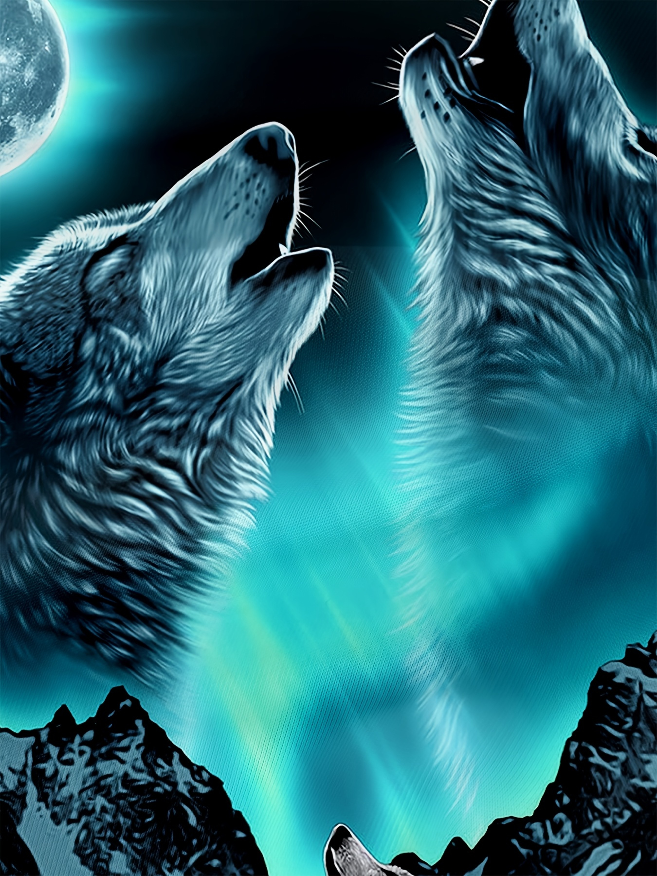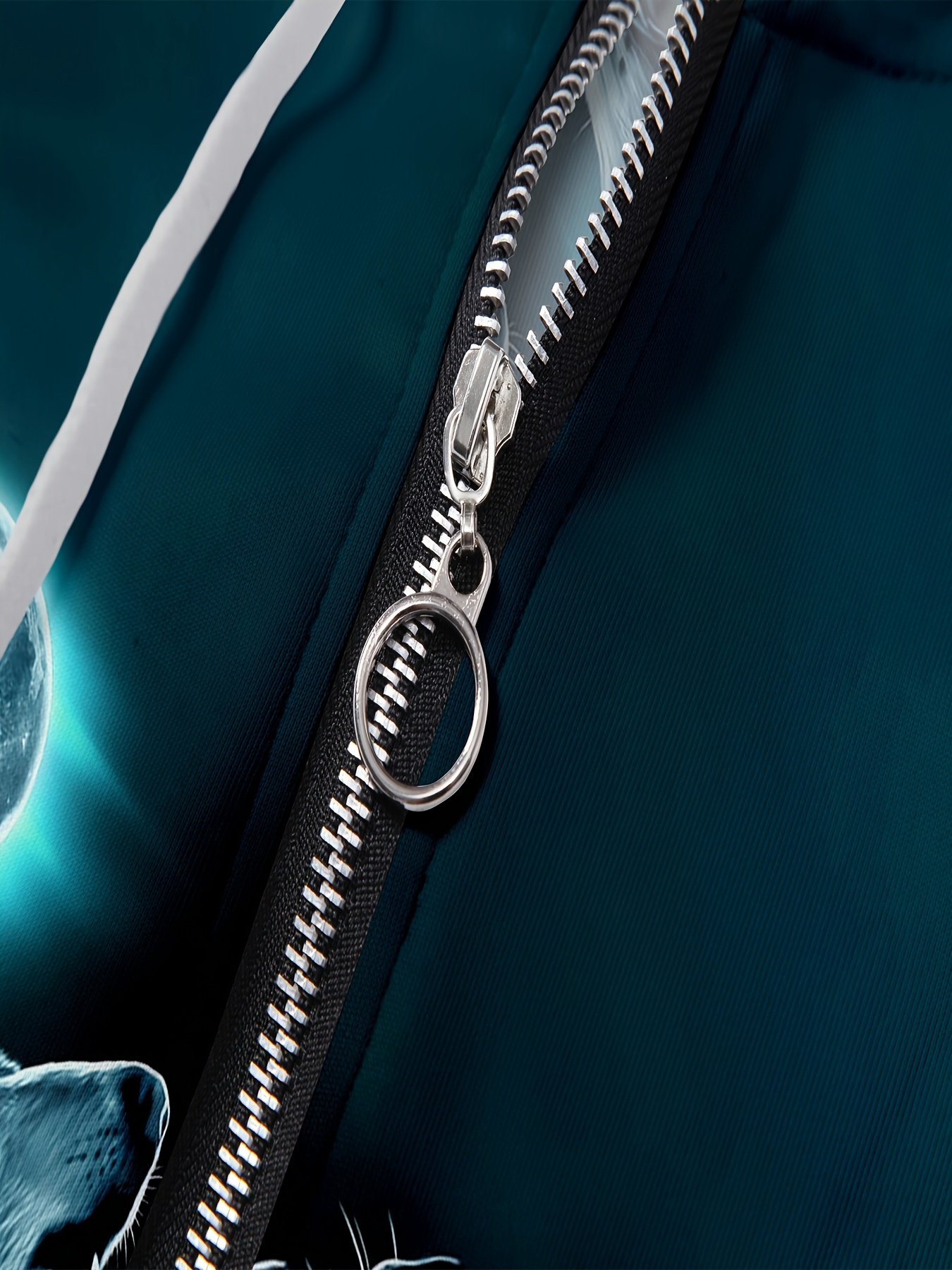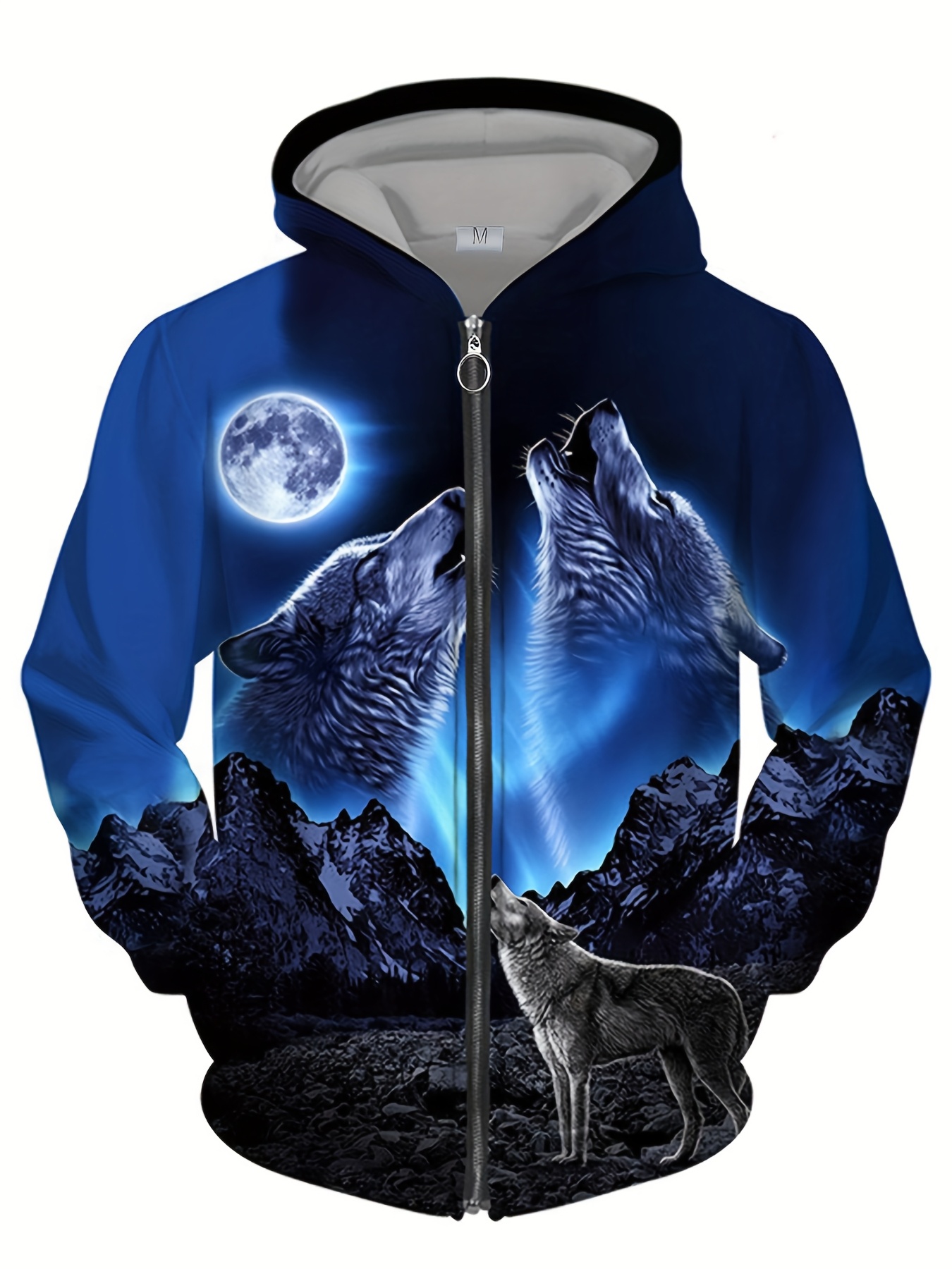 Men'S Moonlit Wolf Howl 3D Print Hooded Zip-Up Sweatshirt - Deep Blue Wolf Pack & Snow Mountain Night Sky Design, Loose Fit Casual Outdoor Winter Wear, Full-Zip Hoodie for Camping & Hiking, Durable 3D Print Graphic Apparel, Plus Size