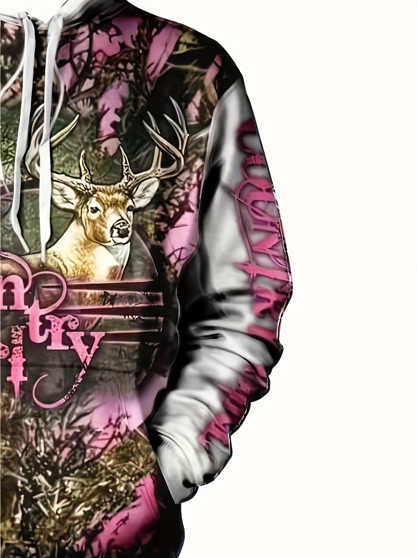Men'S 3D Deer Print Hooded Jacket with Pink Camo & Country Girl Lettering - Long Sleeve Casual Hunting & Outdoor Hoodie, Adjustable Drawstring Pocket, Spring/Fall Camouflage Coat for Daily Wear (Regular Fit, Deer Stag Design), Plus Size