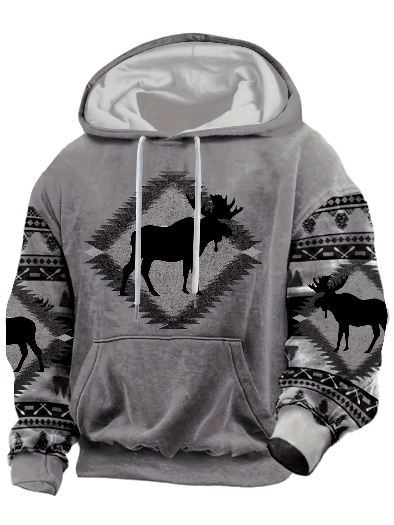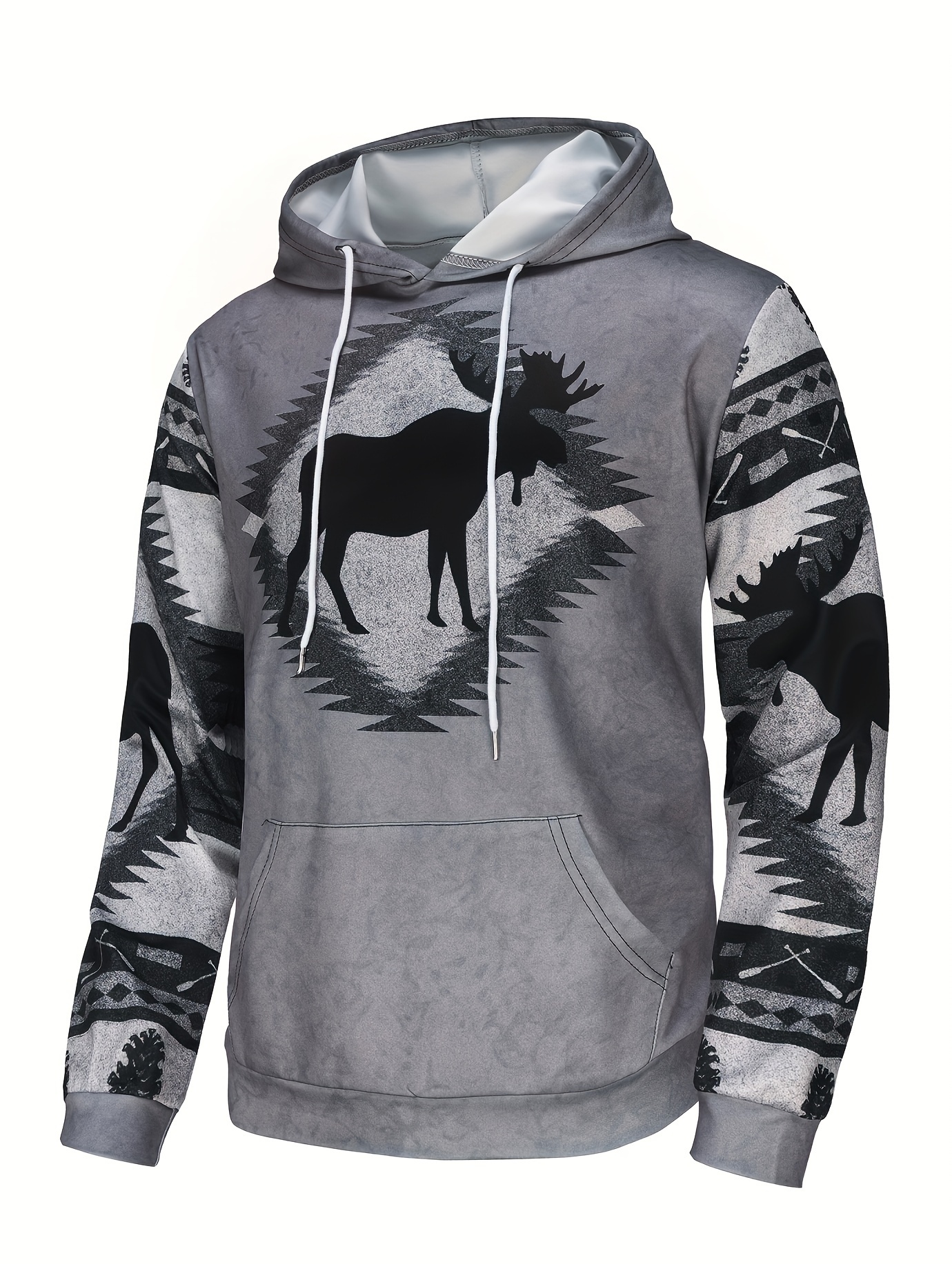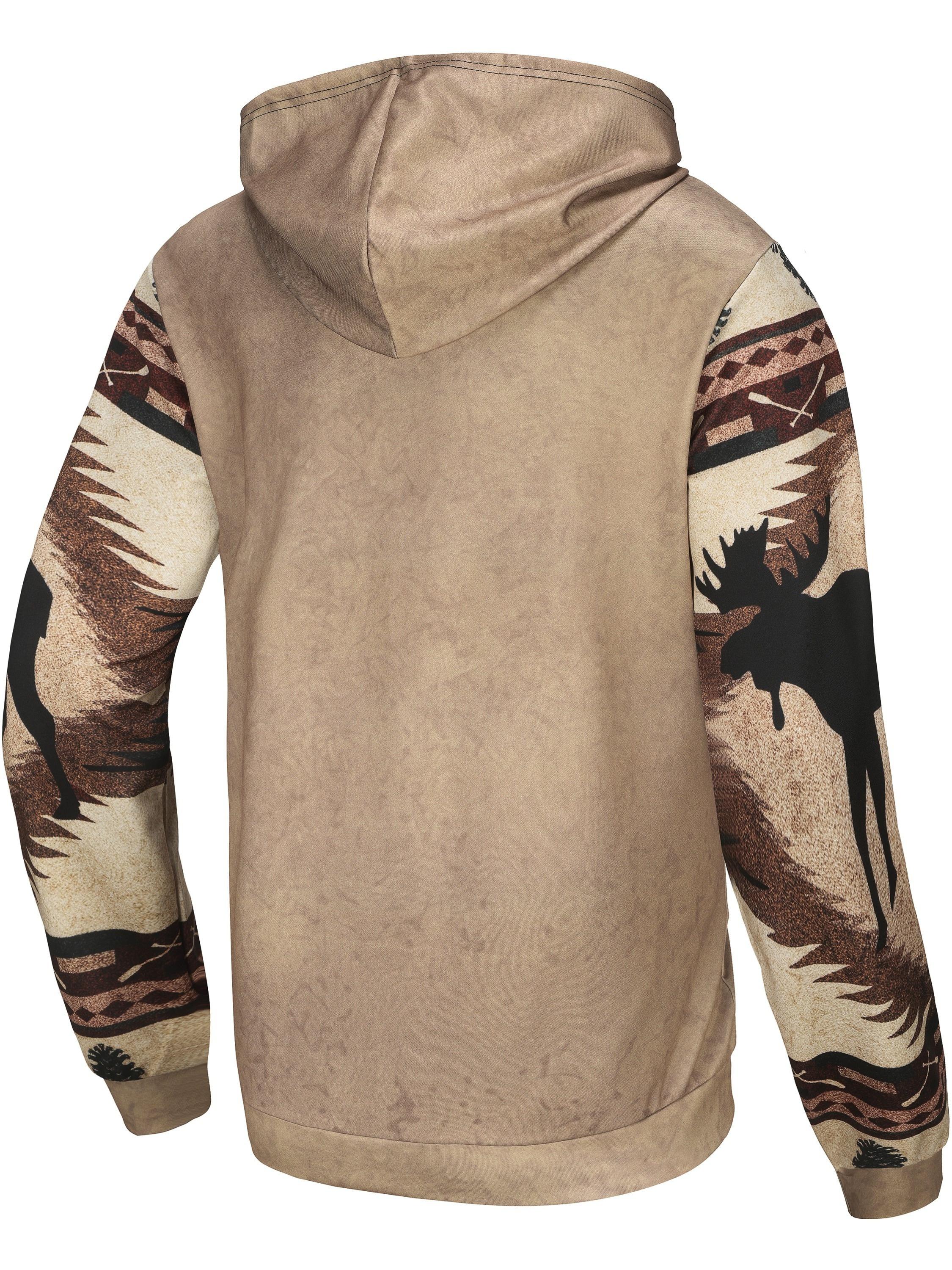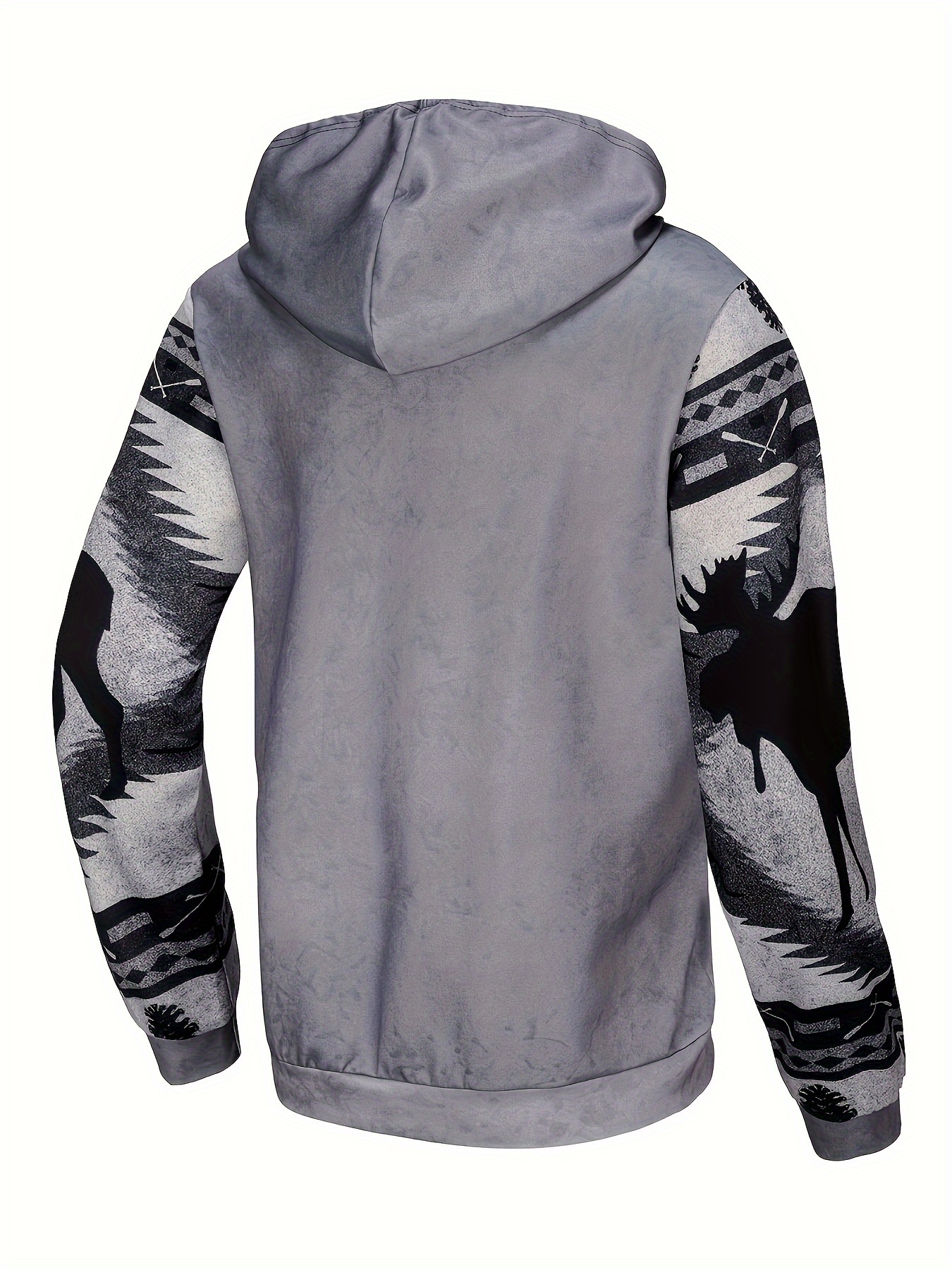 Men'S 3D Digital Print Moose & Reindeer Animal Pattern Hooded Sweatshirt - Winter Warmth Loose Fit Zipper Pullover, Grey & Retro Streetwear with Fur-Like Collar, Casual Long Sleeve Sweater for Autumn and Winter Outdoor Activities, Plus Size