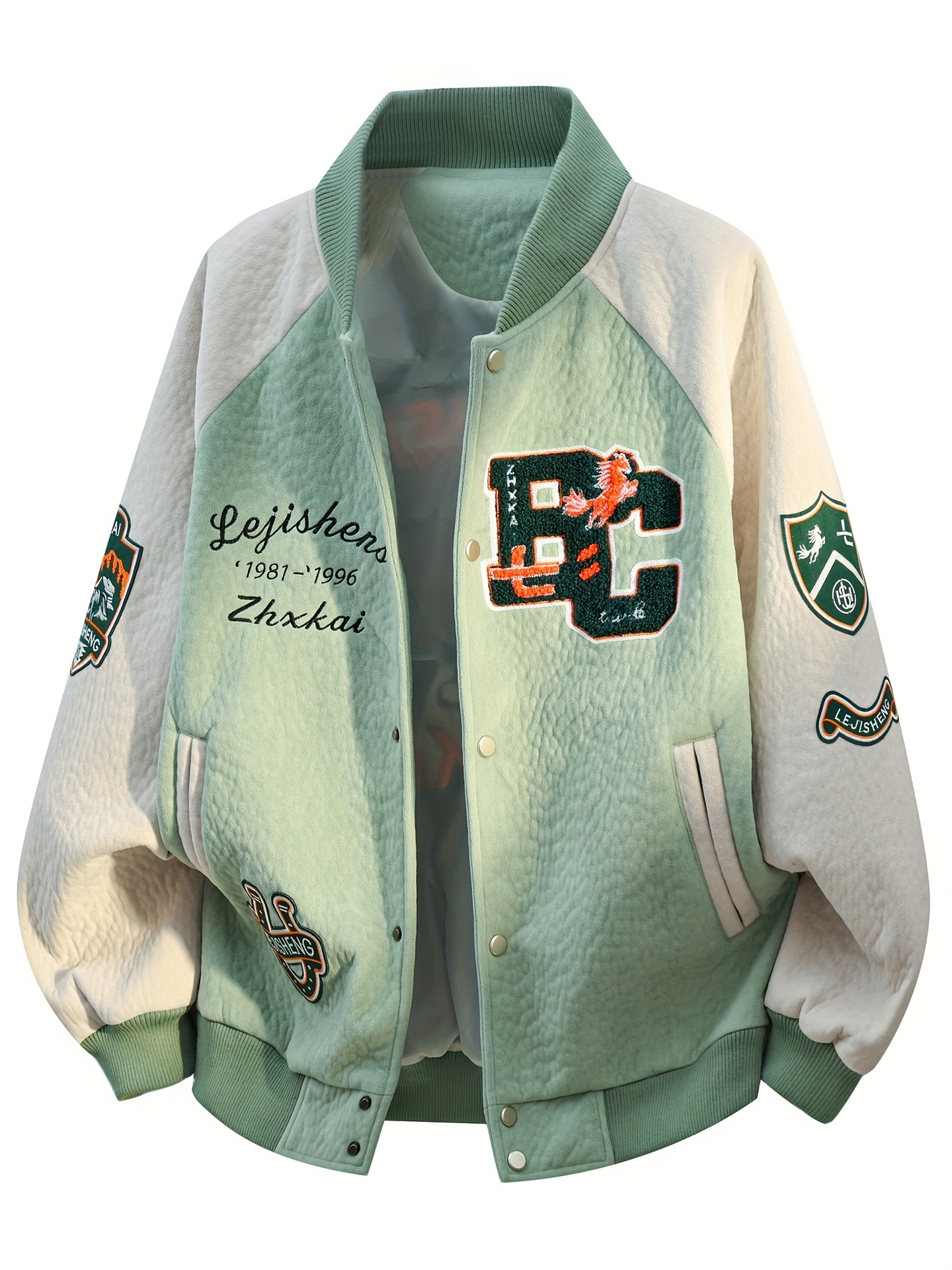 Men's Large Size Heavy-Duty Embellished Varsity Jacket - Mint Green & White Two-Tone with Lettering, Team Logos & Number 95 Emblem - Machine Washable Button-Front Coat for Casual Wear, Events & Themed Parties (V, PLUS SIZE