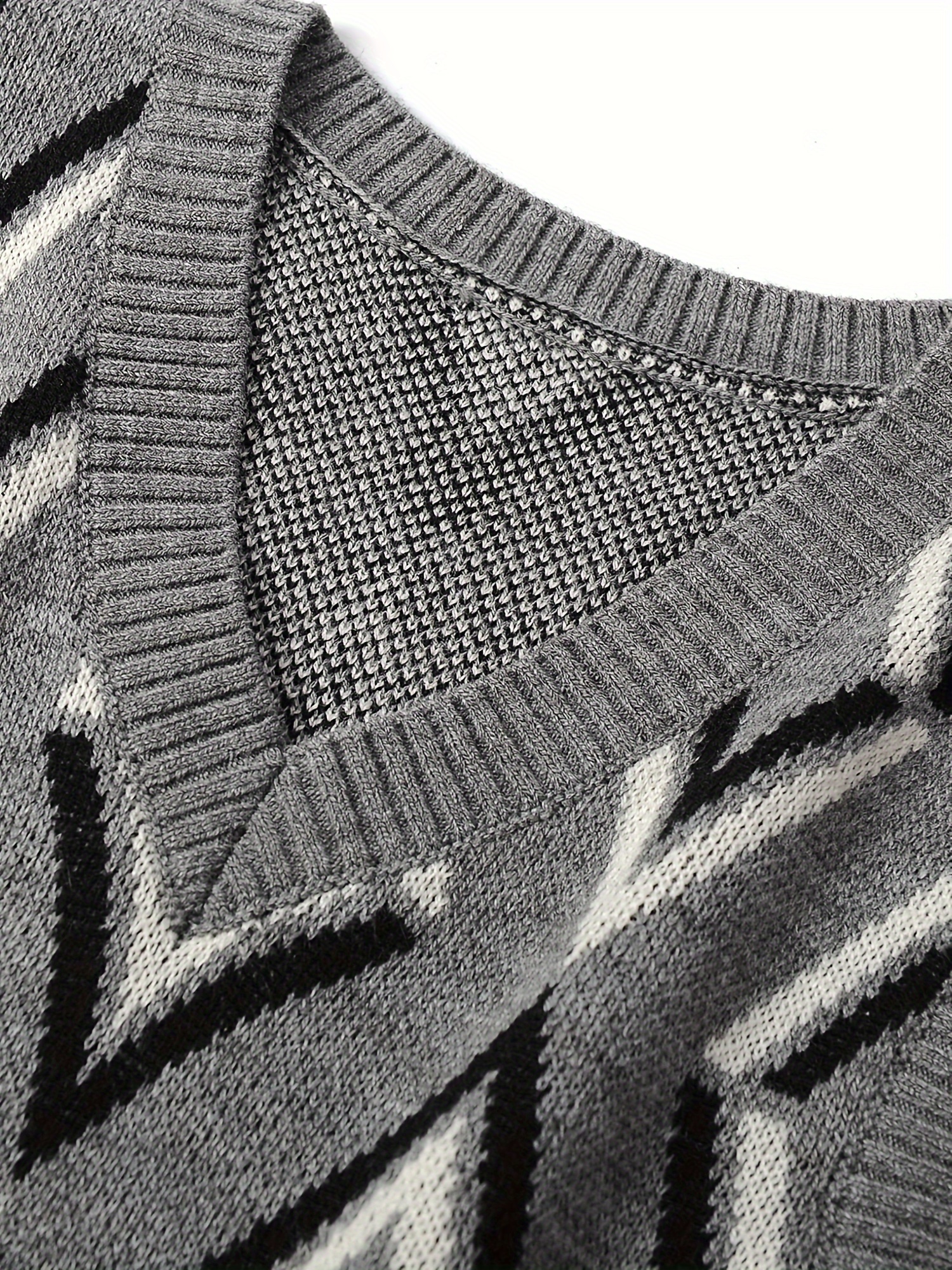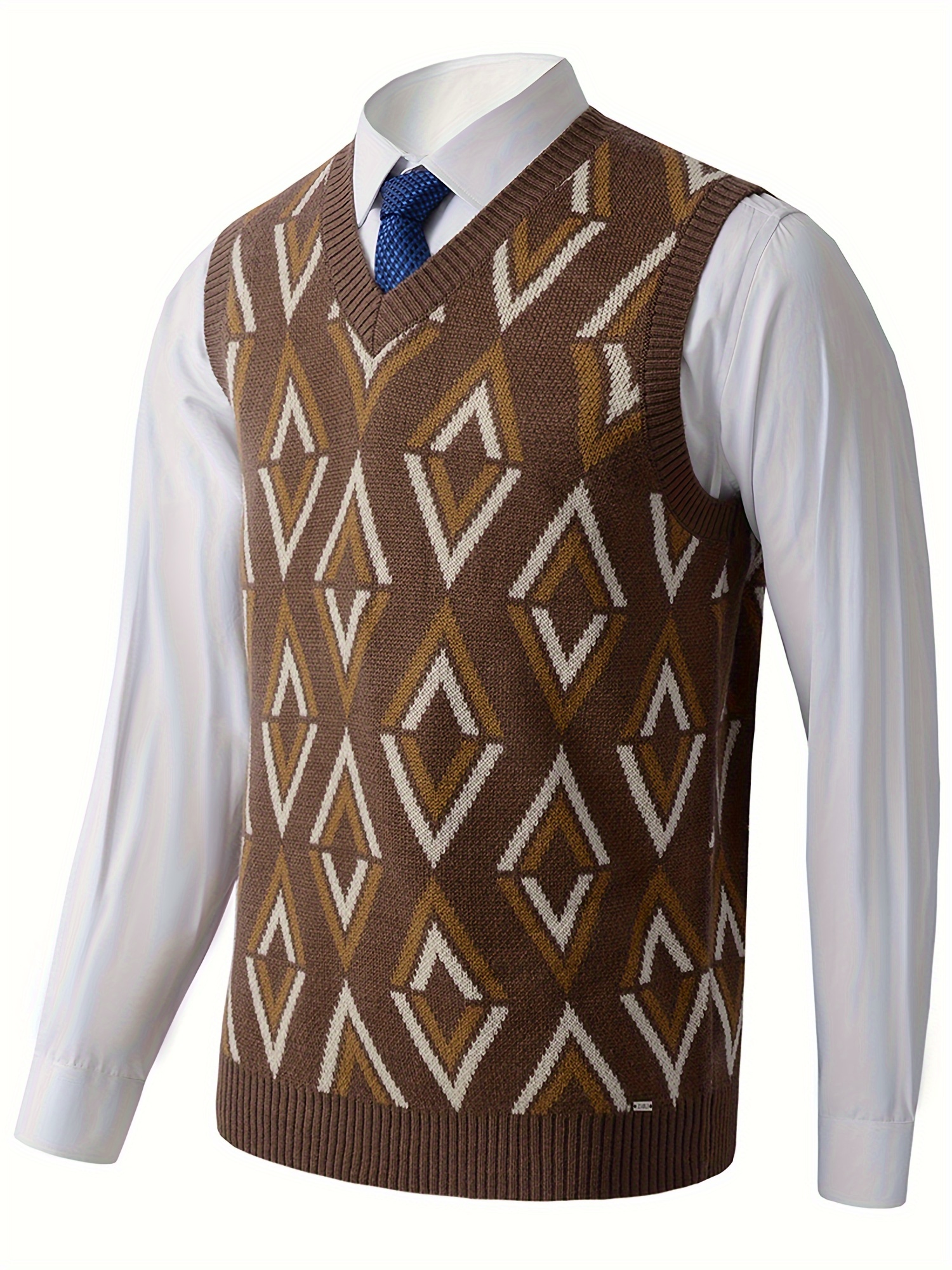 Men's Soft Beige/Brown/Argyle Sweater Vest - Slim Fit V-Neck Pullover, Knit Office & Formal Attire, Autumn/Winter Layering Piece for Business Casual or Casual Attire, Sophisticated Weave, Ribbed Texture, PLUS SIZE