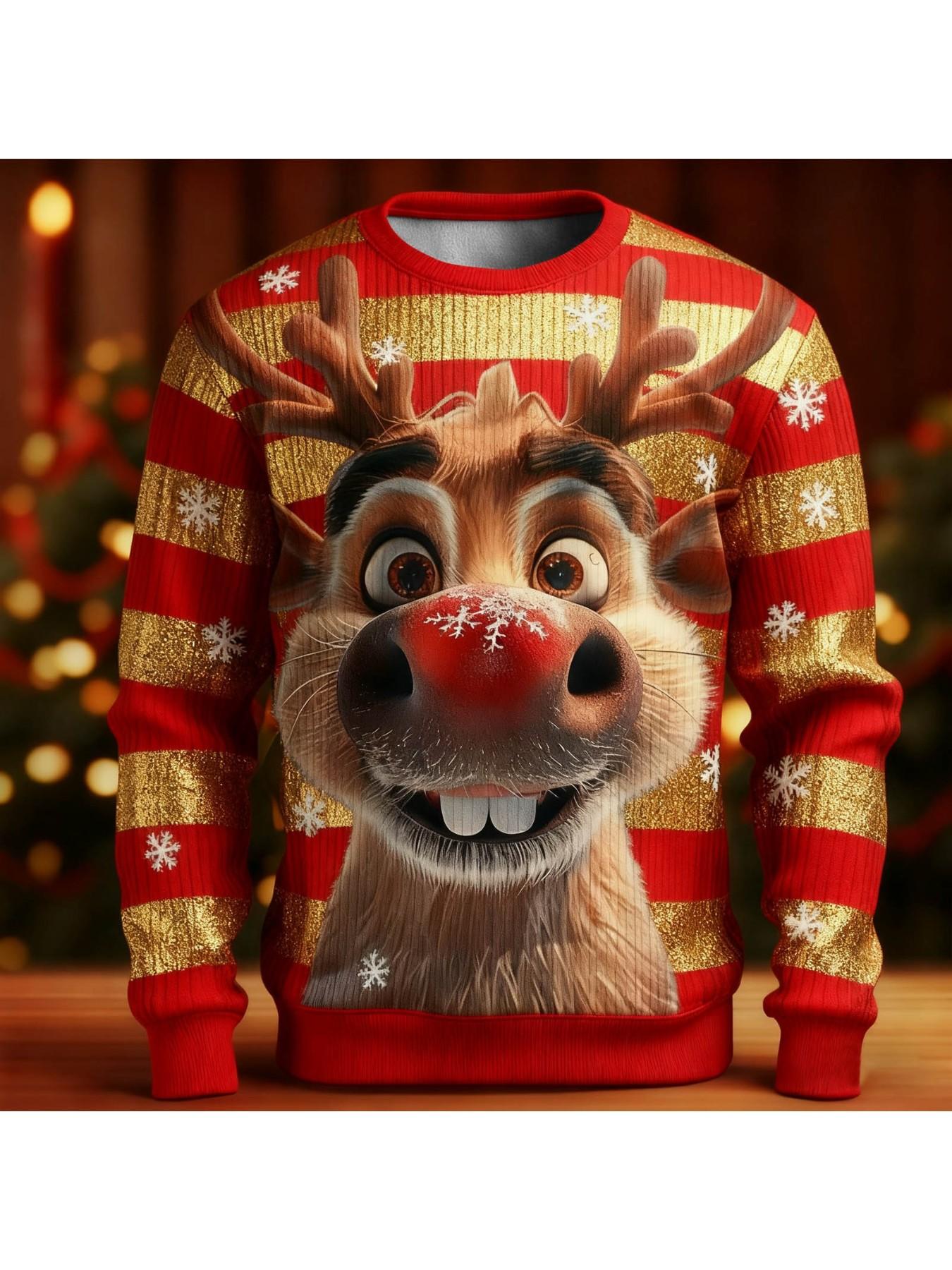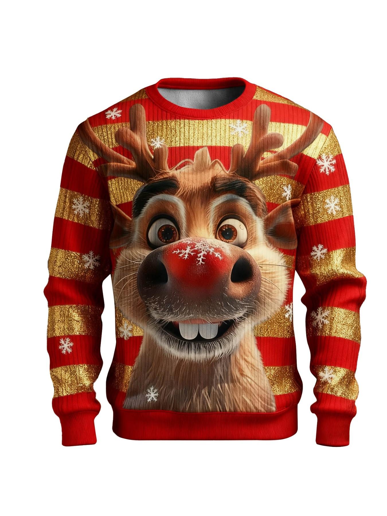 Men'S & Women'S Ugly Christmas Sweater - Reindeer & Snowflake Print Thermal Winter Pullover, Soft Ribbed Crewneck Sweatshirt with Red & Green Stripes, Plus Size